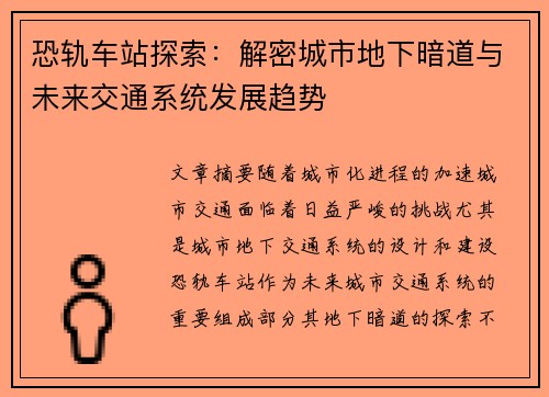 恐轨车站探索:解密城市地下暗道与未来交通系统发展趋势